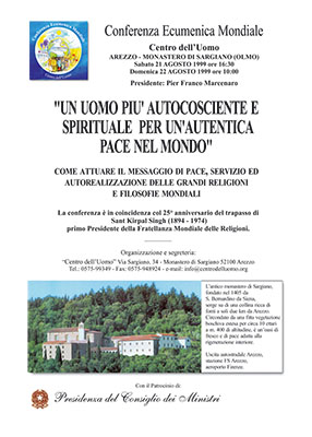 Studiosi di 4 continenti, riunitisi nello storico Monastero di Sargiano presso Arezzo, hanno dato vita alla "Conferenza Ecumenica Mondiale per la Pace e la Prosperità dei Popoli", promossa dall'Associazione internazionale Centro dell'Uomo con la Presidenza di Pier Franco Marcenaro.